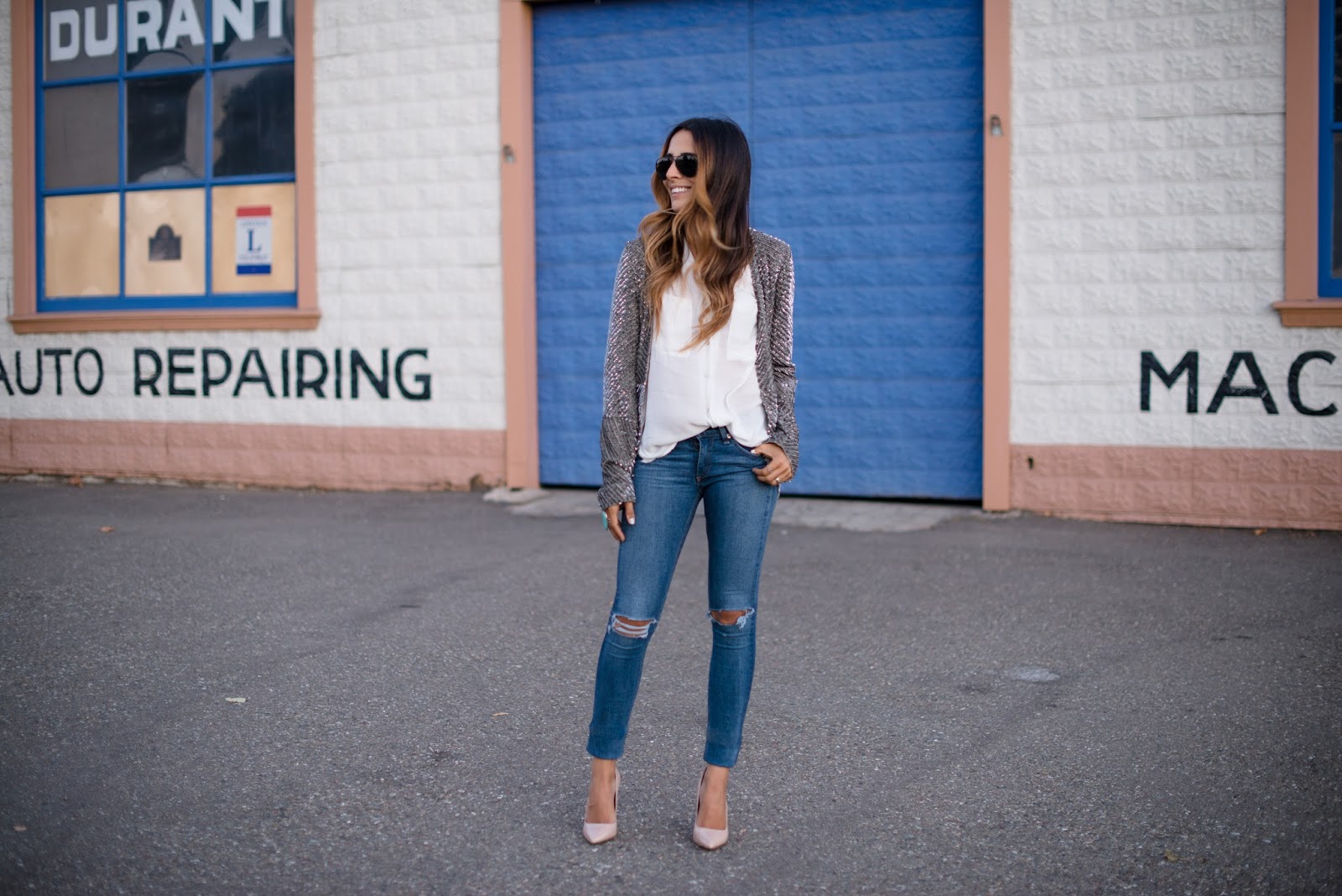 When I want to wear something sparkly like this during the day, I usually try to keep the rest of my outfit pretty simple: ripped jeans, a chic blouse and my go-to nude pumps. I would probably wear this outfit if I had client meetings (the beauty of being your own boss) or a fun lunch with girlfriends..but who am I kidding- I'd wear this pretty jacket anywhere!